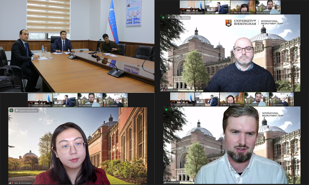 Joriy yilning 19 fevral kuni ZOOM orqali “El-yurt umidi” jamg‘armasi ijrochi direktor o‘rinbosari v.b. Javohir Axmedov, Bo‘limi boshliqlari hamda Buyuk Britaniyaning Birmingem universitetining Xalqaro aloqalar departamenti boshlig‘i Michael Bissell, Birmingem universiteti Xalqaro talabalarni qabul qilish fakulteti dekani Karl Adaway hamda Birmingem universitetining xalqaro aloqalar bo‘yicha menejeri Ven Xao bilan onlayn uchrashuv bo‘lib o‘tdi.