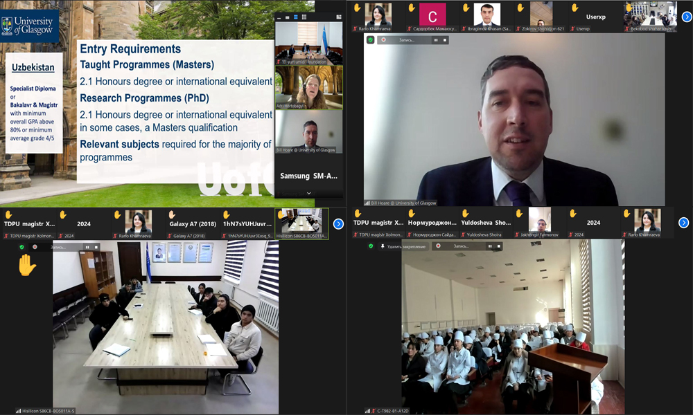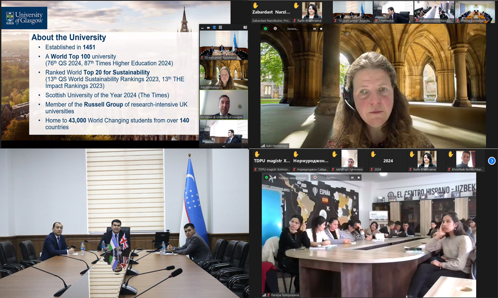 2024 йилнинг 4 март куни Олий таълим, фан ва инновациялар вазирлиги тизимидаги университетларнинг битирувчи курс талабалари ҳамда ўқитувчилари учун “Глазго университетида бакалавриат, магистратура ва докторантура таълим дастурларида таҳсил олиш имкониятлари” мавзусида ZOOM иловаси орқали вебинар ташкил этилди.