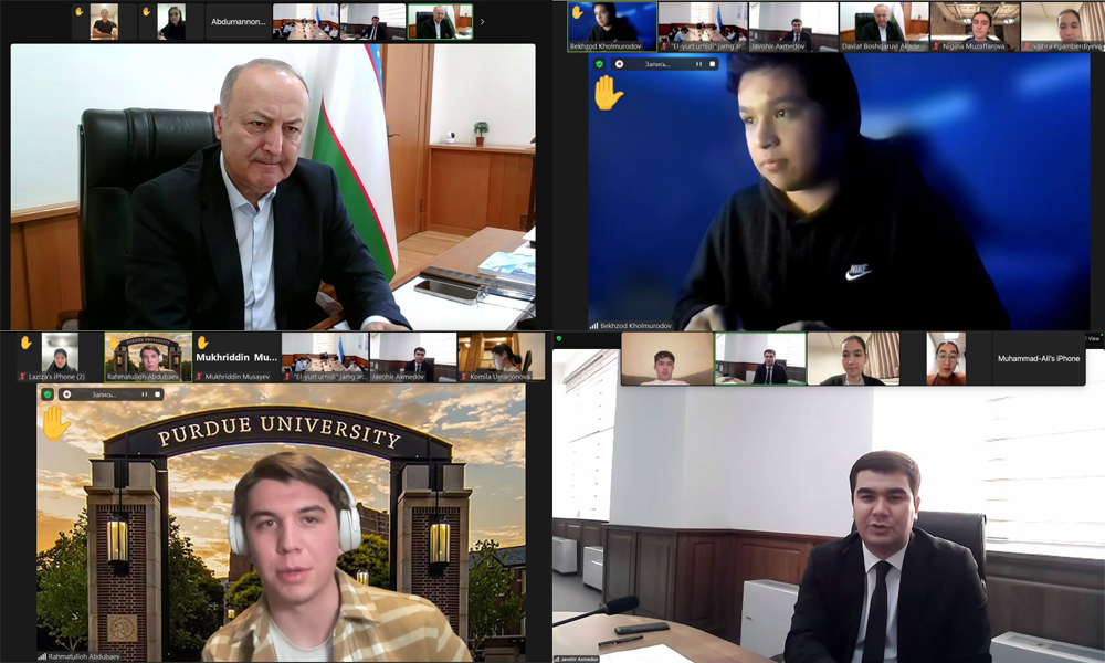 Жорий йилнинг 26 апрель куни “Эл-юрт умиди” жамғармаси ижрочи директори А. Бекмуродов Жамғарманинг раҳбар ходимлари ва Жамғарманинг хорижий нуфузли университетларида таълим олаётган стипендиатлари иштирокида ZOOM платформаси орқали онлайн мулоқот ўтказилди.