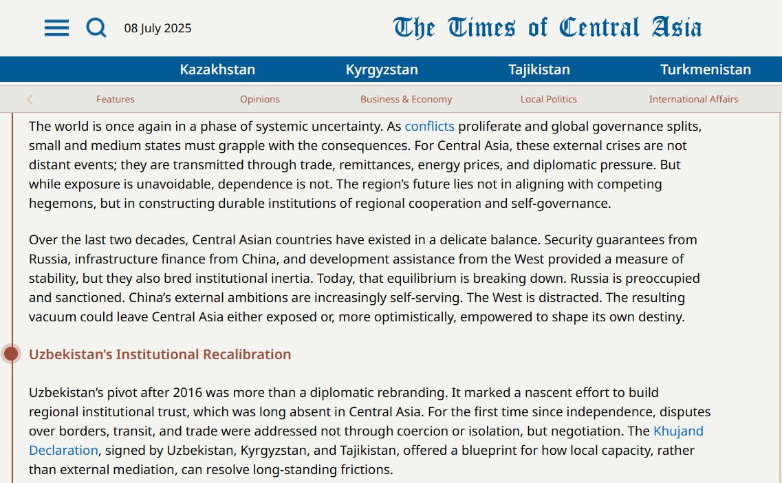 Maqolada, xususan, Oʻzbekiston yetakchiligida 2016-yildan boshlab qoʻshni mamlakatlar oʻrtasida oʻzaro ishonchni mustahkamlashga xizmat qilayotgan islohotlarga alohida eʼtibor qaratilgan.