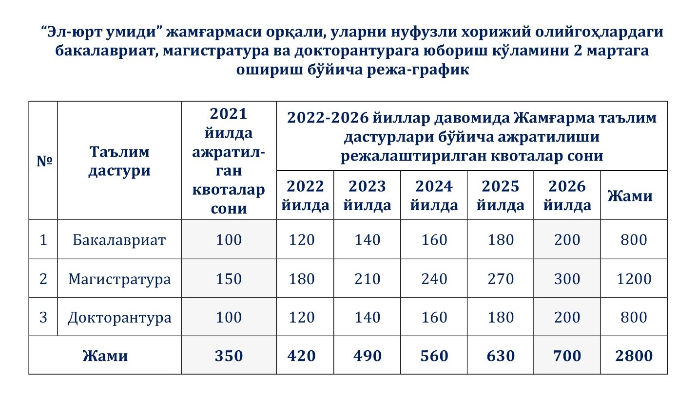 Президентимизнинг 2020 йил 29 декабрда Ўзбекистон Республикаси Олий Мажлиси ва халқига қилган Мурожаатномасида ҳар йили илм-фаннинг бир нечта йўналишига устувор аҳамият қаратилиб, уларни жадал ривожлантирилишини таъкидлаган эди. Жумладан, “Эл-юрт умиди” жамғармаси томонидан илк маротаба бакалавриатга 100 ўрин, магистратура ва докторантурага эса олдинги йилларга нисбатан 5 баробар кўп ўрин ажратиш ташаббуси эълон қилинди.