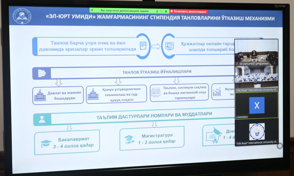 Жорий йилнинг 10 январь куни “Ипак йўли” туризм ва маданий мерос халқаро университетига “Эл-юрт умиди” жамғармасининг (бакалавриат, магистратура ва докторантура) таълим дастурлари асосида хориждаги нуфузли таълим ва илмий муассасаларда таълим олишини ташкил этиш, профессионал, чуқур билимга эга, замонавий фикрлайдиган ва ватанпарварлик руҳида тарбияланган янги авлод кадрларини шакллантириш ва уларни давлат хизматига жалб ҳақида вебинар бўлиб ўтди.