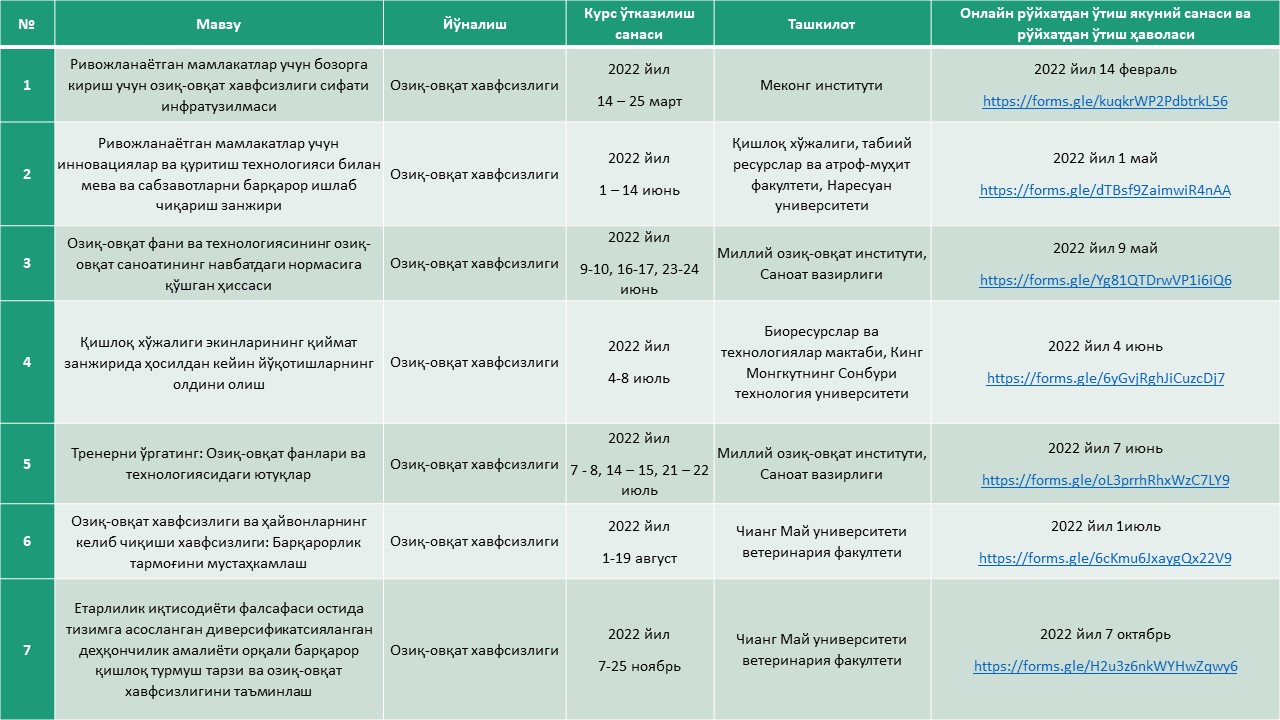 Таиланд Ташқи ишлар вазирлиги қошидаги Халқаро ҳамкорлик агентлиги (TICA – Thailand International Cooperation Agency) томонидан 2022 йил давомида қуйидаги бир қатор ўқуа курсларини таклиф этади: