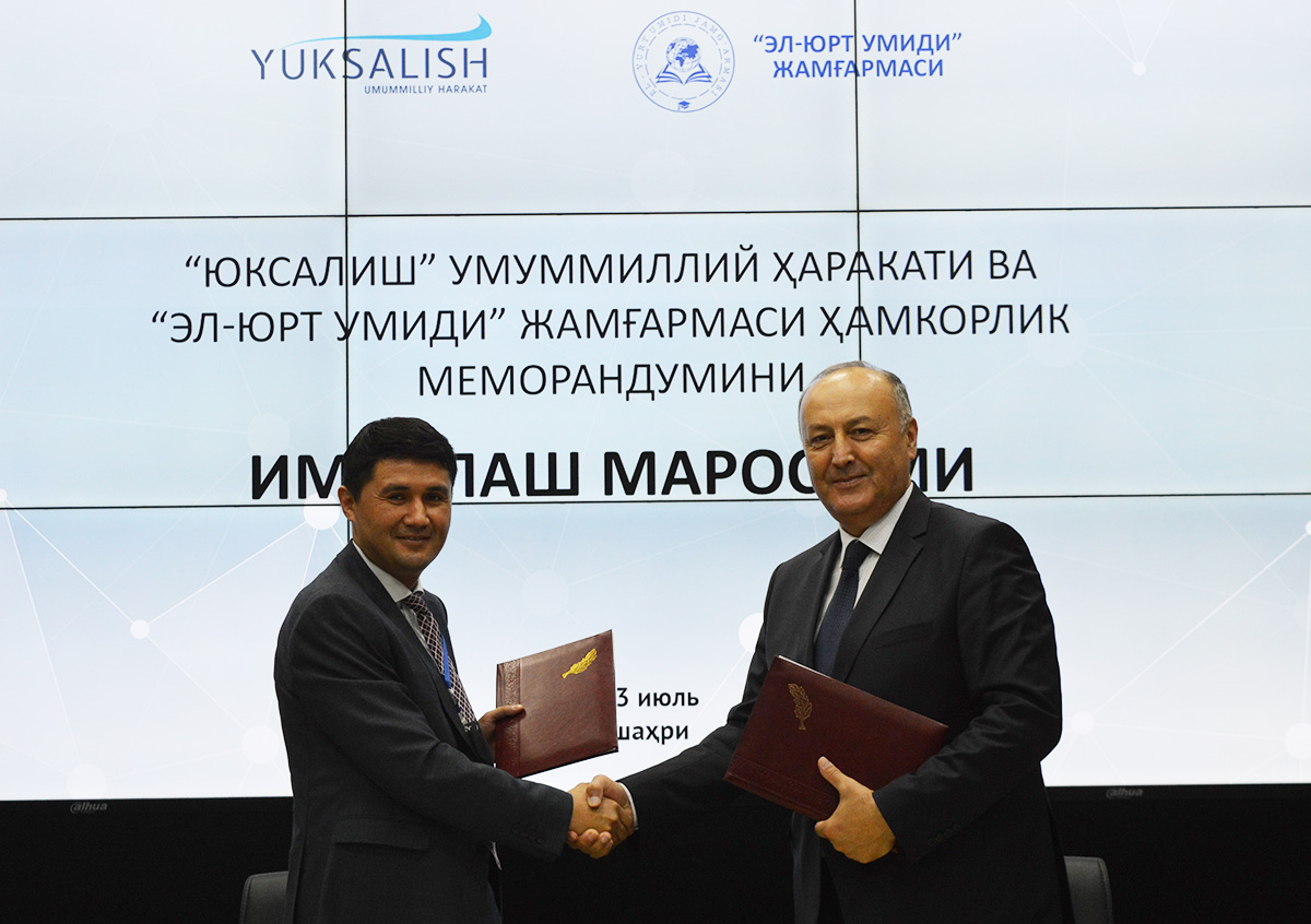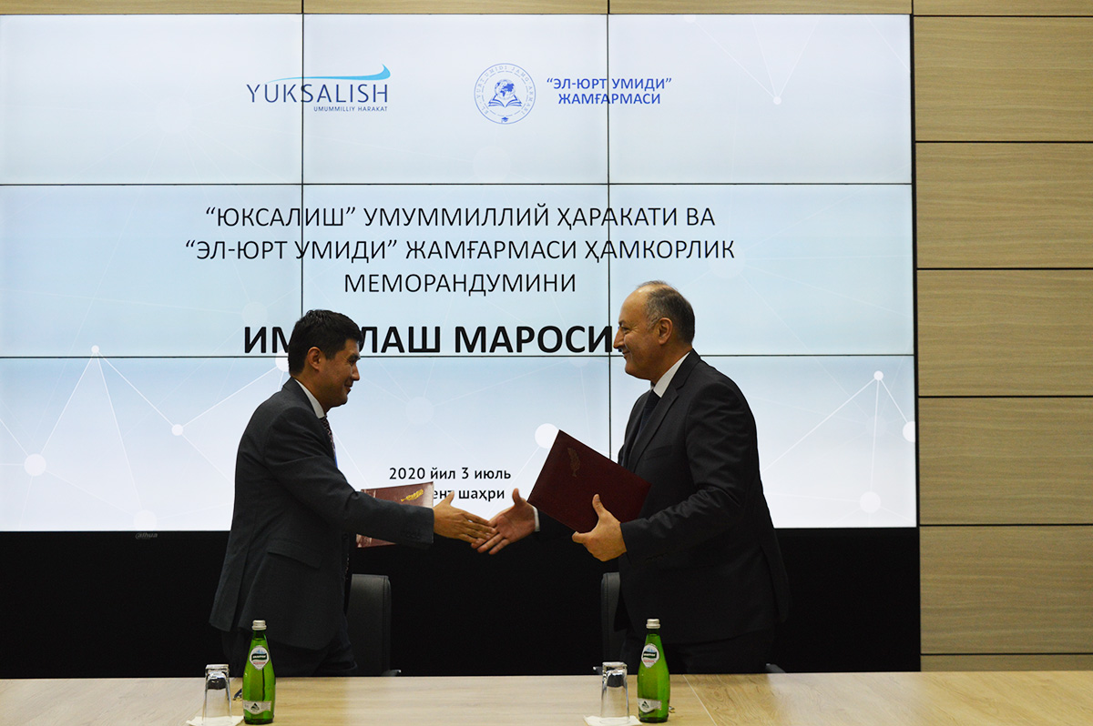 Жорий йилнинг 3 июль куни Ўзбекистон Республикаси Президенти ҳузуридаги Давлат хизматини ривожлантириш агентлиги қошидаги “Эл-юрт умиди” жамғармаси ва “Юксалиш” умуммиллий ҳаракати ўртасида ўзаро ҳамкорлик Меморандуми имзоланди.