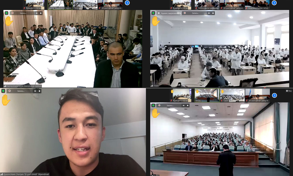 Онлайн учрашувни, “Эл-юрт умиди” жамғармаси ижрочи директор ўринбосари в.б. Ж.Ахмедов томонидан Жамғарма очиқ стипендия танловларини ўтказиш тартиби, ажратилган квоталар, устувор йўналишлар, танловни ташкил этиш механизми ҳамда электрон ҳужжат топшириш платформасининг ишлаш тартиби билан боғлиқ янгиликлар тўғрисида тақдимот қилинди.