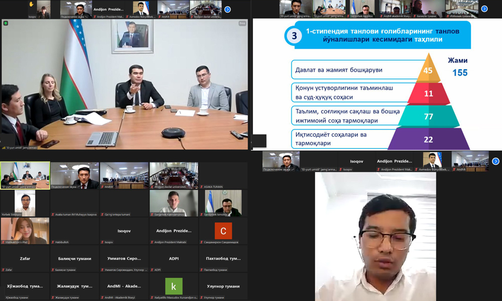 Онлайн мулоқотда иштирок этган Андижон вилоятидан бўлган “Эл-юрт умиди” жамғармаси стипендиатлари томонидан Жамғарма танловлари ва нуфузли хорижий университетлардаги ўқиш имкониятлари тўғрисида семинар иштирокчиларига маълумотлар берилди.